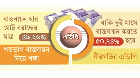 নানা উদ্যোগের কথা বলা হলেও গতি নেই বার্ষিক উন্নয়ন কর্মসূচি (এডিপি) বাস্তবায়নে। এর প্রমাণ মেলে এডিপি বাস্তবায়ন হারে। চলতি অর্থবছরের ১০ মাসে (জুলাই-এপ্রিল) বাস্তবায়ন হয়েছে ৪৯ দশমিক ২৬ শতাংশ। অর্থবছর শেষ হতে বাকি আর দুমাস। এই সময়ের মধ্যে বাস্তবায়ন করতে হবে ৫০ দশমিক ৭৪ শতাংশ। ফলে শতভাগ বাস্তবায়ন নিয়ে দেখা দিয়েছে শঙ্কা। বিশেষজ্ঞরা বলছেন, চলতি অর্থবছর এডিপির শতভাগ বাস্তবায়ন সম্ভব নয়। কয়েক বছর ধরে একই চিত্র দেখা গেলেও বাস্তবায়নের দিকে কোনো পরিবর্তন লক্ষ্য করা যাচ্ছে না।