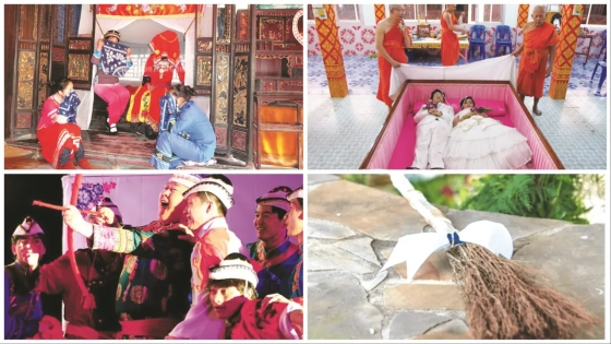 বিয়ে মানেই অনেকের আনন্দময় জীবনের কফিনে শেষ পেরেক ঠুকে দেওয়া। কিন্তু থাইল্যান্ডের ১০টি দম্পতি কফিনে শুয়েই বিবাহিত জীবনের জন্য আশীর্বাদ নিয়েছিলেন। অধিকাংশ মানুষ জীবিত অবস্থায় যেখানে কফিনে শুতে ভয় পায়, সেখানে ১০ দম্পতি কফিনে শুয়েই পালন করলেন এক অদ্ভুত রীতি। ঘটনা ২০১৫ সালের ভালোবাসা দিবসেই ঘটে। ব্যাংককের ব্যাং ক্রুয়ে শহরে সেদিন ১০ জোড়া দম্পতি মন্দিরে আসে ভালোবাসার গাঁটছড়া বাঁধতে। সাদা চাদরে আবৃত গোলাপি কফিনে শুয়ে পড়েন তারা। আর সন্ন্যাসীরা তাদের চাদরে মুড়িয়ে শেষকৃত্যের অনুষ্ঠানের মতোই মন্ত্র জপেন। এরপর অবশ্য সন্ন্যাসীরা তাদের বিবাহিত জীবনের জন্য প্রার্থনাও করেন। প্রাচীন এক আচারের অনুসারী ওই ১০ দম্পতির বিশ্বাস ছিল, এমনটা করার ফলে তাদের বিবাহিত জীবনের সব বাধা কেটে যাবে।