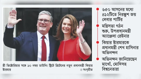 যুক্তরাজ্যে নির্বাচনে বিপুল বিজয়ের পর নতুন প্রধানমন্ত্রী হিসেবে ১০ নম্বর ডাউনিং স্ট্রিটে দেওয়া প্রথম ভাষণে দেশকে নতুনভাবে গড়ে তোলার প্রতিশ্রুতি দিয়েছেন লেবার পার্টির নেতা কিয়ার স্টারমার। তিনি বলেছেন, ‘আমাদের দেশ পরিবর্তনের পক্ষে ভোট দিয়েছে। রাজনীতিকে জনগণের সেবায় ফিরিয়ে দিয়েছে।’ তবে এ পরিবর্তন আনতে যে কিছুটা সময় লাগবে, সেটাও স্বীকার করে নেন নতুন এ প্রধানমন্ত্রী। এদিকে যুক্তরাজ্যের পার্লামেন্টের নিম্নকক্ষ হাউস অব কমন্সের ৬৫০টি আসনের মধ্যে ৪১২টিতে নিরঙ্কুশ জয় পেয়ে অভিনন্দনে ভাসছেন কিয়ার স্টারমার। প্রধানমন্ত্রী নির্বাচিত হওয়ায় কিয়ার স্টারমারকে ইতোমধ্যে অভিনন্দন জানিয়ে চিঠি পাঠিয়েছেন প্রধানমন্ত্রী শেখ হাসিনা। শুক্রবার নবনির্বাচিত ব্রিটিশ প্রধানমন্ত্রীকে ওই চিঠি পৌঁছে দেওয়ার কথা জানায় লন্ডনে বাংলাদেশ হাইকমিশন। এ ছাড়া, ফ্রান্সের প্রেসিডেন্ট ইমানুয়েল মাখোঁ ও ভারতের প্রধানমন্ত্রী নরেন্দ্র মোদিসহ বিশ্বনেতারা নতুন ব্রিটিশ প্রধানমন্ত্রীকে অভিনন্দন জানিয়েছেন।