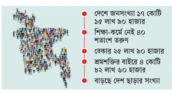 দেশে জনসংখ্যা প্রতিনিয়ত বাড়ছে; কিন্তু সে তুলনায় বাড়ছে না কর্মসংস্থান। যে কারণে দেশে শ্রমশক্তির বাইরে থাকা মানুষ এবং বেকার জনগোষ্ঠীর হার বাড়ছে। আবার মোট জনসংখ্যার মধ্যে সবচেয়ে বেশি তরুণ হলেও তাদের উল্লেখযোগ্য অংশ অলস সময় কাটাচ্ছে। তাদের না আছে শিক্ষা, না আছে কাজ। দেশের সম্পদ না হয়ে উল্টো বোঝা হচ্ছে তারা। এ অবস্থায় দেশের জনসংখ্যা কবে জনসম্পদ হবে, সেই প্রশ্ন উঠেছে। বাংলাদেশ পরিসংখ্যান ব্যুরোর (বিবিএস) তথ্য অনুযায়ী, চলতি বছরের ৩১ জানুয়ারি পর্যন্ত দেশের জনসংখ্যা দাঁড়িয়েছে ১৭ কোটি ১৫ লাখ ৯০ হাজার। ২০২২ সালের জনশুমারি অনুযায়ী জনসংখ্যা ছিল ১৬ কোটি ৯৮ লাখ ২৮ হাজার ৯১১ জন। সেই হিসাবে ২০২৪ সালে এসে জনসংখ্যা বেড়েছে ১৭ লাখ ৬১ হাজার ৮৯ জন। বিবিএসের হিসেবে, বর্তমানে দেশে মোট জনসংখ্যার প্রায় ৬২ শতাংশই কর্মক্ষম মানুষ। তরুণের সংখ্যা বাড়তে থাকায় দেশে কর্মক্ষম মানুষের সংখ্যাও বৃদ্ধি পেয়েছে বলে উঠে এসেছে জনশুমারি ও গৃহগণনার চূড়ান্ত প্রতিবেদনে। বর্তমানে দেশে কর্মক্ষম জনগোষ্ঠীর ৩ ভাগের ২ ভাগই তরুণ। কিন্তু সেই তরুণদের ৪০ শতাংশই অলস বসে আছে। এদিকে আজ বৃহস্পতিবার পালিত হচ্ছে বিশ্ব জনসংখ্যা দিবস। দিবসটির এবারের প্রতিপাদ্য—‘অন্তর্ভুক্তিমূলক উপাত্ত ব্যবহার করি, সাম্যের ভিত্তিতে সহনশীল ভবিষ্যৎ গড়ি’। দিবসটি উপলক্ষে বাণী দিয়েছেন রাষ্ট্রপতি মো. সাহাবুদ্দিন ও প্রধানমন্ত্রী শেখ হাসিনা।
