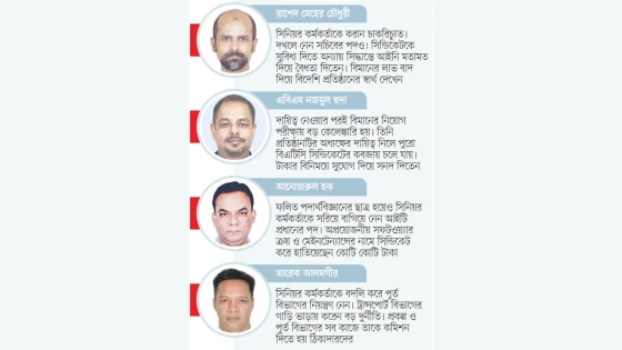 সংশ্লিষ্ট বিভাগগুলোর সূত্র জানায়, আওয়ামী লীগ সরকারের আমলে এই পঞ্চরত্ন তাদের নিজ নিজ বিভাগের সিনিয়র কর্মকর্তাদের চাপ দিয়ে ও অবৈধভাবে বদলি করেন। কোনো কোনো ক্ষেত্রে চাকরিচ্যুত করে সংশ্লিষ্ট বিভাগের প্রধান কর্মকর্তার পদ দখল করেছিলেন। এরপর তারা সিন্ডিকেট গড়ে বিমানে নিয়োগ বাণিজ্য, সফটওয়্যার ক্রয়ে দুর্নীতি, প্রকল্পের ভেন্ডর নিয়োগে দুর্নীতি, অসংখ্যবার অপ্রয়োজনীয় অফিসিয়াল বিদেশ ভ্রমণ, অন্যায় পদোন্নতি, বদলি বাণিজ্য, শ্রমিকের ন্যায্য ওভারটাইম প্রদানে বাধা দেওয়াসহ নানা ধরনের অপকর্ম করে আসছিলেন।