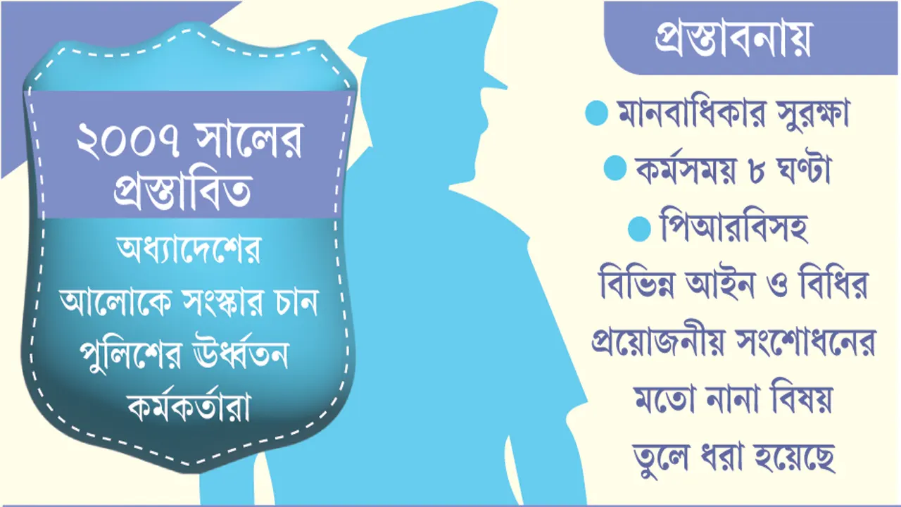 স্বাধীন পুলিশ কমিশন গঠনসহ পুলিশ সংস্কারে একগুচ্ছ প্রস্তাব তৈরি করেছে পুলিশ সদর দপ্তর। এতে জবাবদিহি নিশ্চিত করতে পুলিশের সব সদস্যের কর্মকাণ্ড নিবিড়ভাবে পর্যবেক্ষণ ও তদারকি নিশ্চিত করার কথা বলা হয়েছে। প্রাথমিক খসড়ায় মানবাধিকার সুরক্ষা, পেশাদারিত্ব ও দক্ষতা বাড়ানো, সংস্কারের ক্ষেত্রে আন্তর্জাতিক পর্যায়ে অনুসরণীয় নীতি (বেস্ট পলিসি) গ্রহণ, কর্মসময় ৮ ঘণ্টা নির্ধারণ, পিআরবিসহ বিভিন্ন আইন ও বিধির প্রয়োজনীয় সংশোধন, বিভিন্ন ইউনিটের প্রাতিষ্ঠানিক দক্ষতা বাড়ানোসহ বিভিন্ন ধরনের প্রস্তাব তুলে ধরা হয়েছে। সর্বোপরি ২০০৭ সালের প্রস্তাবিত অধ্যাদেশের আলোকে পুলিশের সংস্কার চান বাহিনীর ঊর্ধ্বতন কর্মকর্তারা।