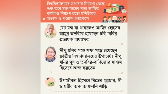 জানা গেছে, জাতীয় বিশ্ববিদ্যালয়ের সাবেক উপাচার্য মশিউর রহমানের সঙ্গে সাবেক মন্ত্রী দীপু মনির গভীর সখ্যের অন্তরালে ছিল তদবির বাণিজ্য। মশিউর ছিলেন দীপু মনির ঘুষ বাণিজ্যের মাধ্যম। তার সময়েই সবচেয়ে বেশি দুর্নীতির জাল ছড়িয়েছে উচ্চশিক্ষা খাতের প্রায় সর্বস্তরে। সিন্ডিকেট করে শত শত কোটি টাকা হাতিয়ে নিয়েছেন তারা। তদবির-বাণিজ্যের জন্য জাতীয় বিশ্ববিদ্যালয়ের উপাচার্য মশিউর রহমান অন্তত অর্ধশতবার চাঁদপুরে দীপু মনির বাসায় আসা-যাওয়া করেছেন। জাতীয় বিশ্ববিদ্যালয়ের টাকা খরচ করে স্পিডবোটে চাঁদপুরে গেছেন অনেকবার। দীপু মনি ও মশিউর দুজনের বিভিন্ন বিশ্ববিদ্যালয় পরিদর্শন, একসঙ্গে অতিথি হওয়া, ঢাকা থেকে চাঁদপুরে নিয়মিত যাতায়াত ছিল সবার চোখে পড়ার মতো। তবে হয়রানি, মামলা-হামলার ভয়ে সবাই তা চেপে যেতেন।