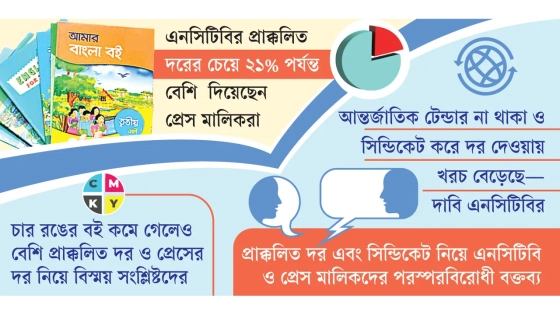 এনসিটিবি সূত্র জানায়, বাজারদর যাচাই করে প্রাক্কলিত দর ঠিক করে এনসিটিবি। আওয়ামী লীগ সরকারের দুই মেয়াদে আন্তর্জাতিক দরপত্রের মাধ্যমে বইয়ের কাজ দেওয়া হতো। যেখানে ভারত, থাইল্যান্ড, চীনসহ বেশ কয়েকটি দেশের মুদ্রণ প্রতিষ্ঠান অংশ নিত, যে কারণে কাজ পেতে প্রাক্কলিত দরের চেয়ে কম দর দিয়ে কাজ নিত দেশীয় মুদ্রণ প্রতিষ্ঠানগুলো। তবে দেশীয় সিন্ডিকেটের কারণে ধীরে ধীরে এসব দেশ কাজ করতে আগ্রহ হারায়। চলতি বছর রাজনৈতিক পটপরিবর্তনের কারণে আন্তর্জাতিক দরপত্র বাতিল করেছে সরকার। যার ফলে এবার দেশীয় প্রেসগুলো সিন্ডিকেট করে বেশি দামে দরপত্র জমা দিয়েছে। নবম ও দশম শ্রেণি বাদে অন্য সব শ্রেণির দরপত্র হয়ে গেছে। প্রথম থেকে তৃতীয় শ্রেণির বই ছাপার কাজও শুরু হয়ে গেছে। এতে প্রাক্কলিত ব্যয়ের চেয়ে সরকারের ৭৮৩ কোটি টাকা বেশি খরচ হচ্ছে। গত বছর যেখানে নতুন পাঠ্যবই বাবদ প্রায় ১ হাজার ৪০০ কোটি টাকা ব্যয় হয়েছিল। এবার সেখানে ২ হাজার কোটির বেশি খরচ হবে।