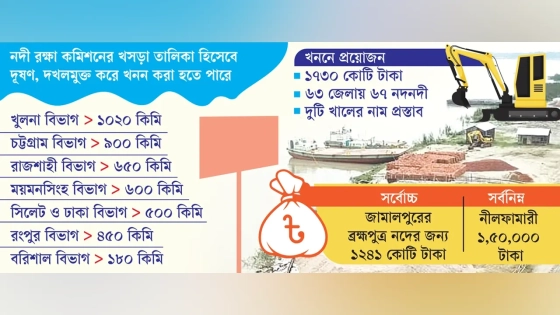 খসড়া তালিকায় দেখা যায়, সর্বোচ্চ খুলনা বিভাগে অন্তত ১ হাজার ২০ কিলোমিটার, চট্টগ্রাম বিভাগে অন্তত ৯০০, রাজশাহী বিভাগে ৬৫০, ময়মনসিংহ বিভাগে ৬০০, সিলেট বিভাগে ৫০০, ঢাকা বিভাগে অন্তত ৫০০, রংপুরে বিভাগে ৪৫০ ও বরিশাল বিভাগে ১৮০ কিলোমিটার নদী দূষণ ও দখলমুক্ত করে খনন করা হতে পারে।