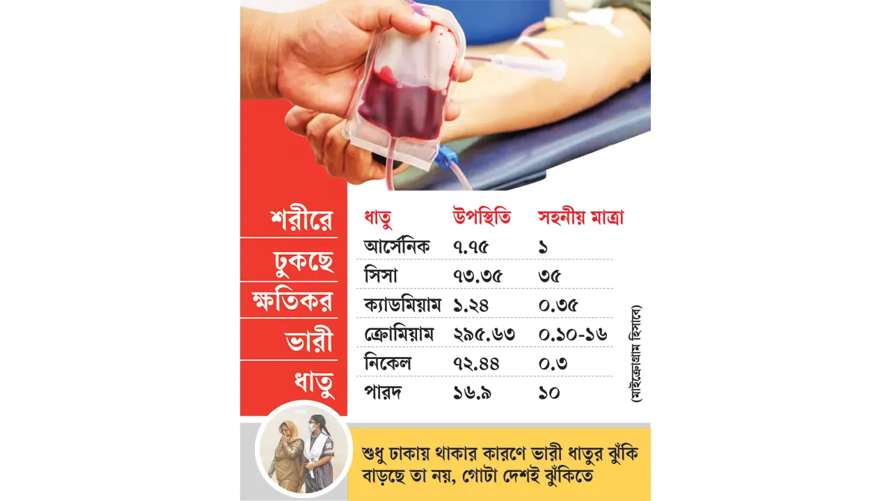 দুর্ঘটনায় আহত, সন্তান প্রসব, লিউকোমিয়া বা যে কোনো ধরনের অস্ত্রোপচার কিংবা রক্তস্বল্পতার রোগীর জীবন বাঁচাতে প্রয়োজন হয় রক্তের। একজন থেকে আরেকজনের শরীরে রক্ত পরিসঞ্চালনের সময় যেন কোনো সংক্রামক রোগে আক্রান্ত না হয়, সেজন্য রক্ত পরীক্ষাও করা হয়। সম্প্রতি এক গবেষণায় দেখা গেছে, রক্ত পরিসঞ্চালনের মাধ্যমে একজন থেকে আরেকজনের শরীরে ছড়িয়ে পড়ছে ক্ষতিকর ভারী ধাতু। যে ধাতুর প্রভাবে শিশুদের বুদ্ধিমত্তা ও মানসিক বিকাশ বাধাগ্রস্ত হয়। প্রাপ্তবয়স্কদের কিডনি বিকল, যকৃত অকার্যকর, এমনকি ক্যান্সারের মতো মরণব্যধিতে আক্রান্ত হয়ে মৃত্যু হতে পারে।
