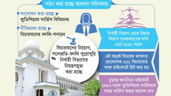 অবশেষে নির্বাহী বিভাগের হাত থেকে বিচারকদের পুরোপুরি মুক্ত করার উদ্যোগ নেওয়া হয়েছে। বিচার বিভাগের জন্য সুপ্রিম কোর্টের নিয়ন্ত্রণে তৈরি করা হচ্ছে পৃথক সচিবালয়। এর মধ্য দিয়েই বিচার বিভাগ পৃথককরণ ঘোষণার পূর্ণতা পেতে যাচ্ছে বলে মনে করছেন বিচার সংশ্লিষ্টরা। পাশাপাশি বিচার বিভাগের স্বাধীনতা নিশ্চিতে এরই মধ্যে বেশকিছু পদক্ষেপ নেওয়া হয়েছে। উচ্চ আদালতের বিচারপতি নিয়োগ প্রভাবমুক্ত করতে জারি করা হয়েছে অধ্যাদেশ। এই অধ্যাদেশের আলোকে গঠিত হবে ‘সুপ্রিম জুডিশিয়াল অ্যাপয়েন্টমেন্ট কাউন্সিল’। স্থায়ী এই কাউন্সিলের মাধ্যমে নিয়োগ হবে বিচারপতি। এ ছাড়া অধস্তন আদালতের বিচারকদের পদোন্নতি, ছুটি, কর্মস্থল নির্ধারণ ও শৃঙ্খলার বিধানও সুপ্রিম কোর্টের হাতে ফিরিয়ে আনার চেষ্টা চলছে। পাশাপাশি বিচারকাজ সম্পূর্ণ রাজনৈতিক প্রভাবমুক্ত করতে সরকারি আইনজীবী নিয়োগের ক্ষেত্রে স্থায়ী অ্যাটর্নি সার্ভিস গড়ে তোলার উদ্যোগ নেওয়া হয়েছে। এসব পদক্ষেপ বাস্তবায়ন হলে বিচার ব্যবস্থায় আমূল পরিবর্তন আসবে বলে মনে করছেন আইন বিশেষজ্ঞসহ সংশ্লিষ্টরা।
