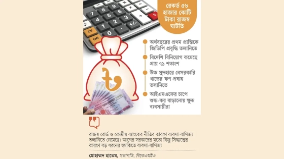 চলতি ২০২৪-২৫ অর্থবছরের প্রথম ছয় মাসে সরকারের রাজস্ব ঘাটতির পরিমাণ দাঁড়িয়েছে প্রায় ৫৮ হাজার কোটি টাকা। আয় কমে যাওয়ায় ব্যয় কমানোর পরিকল্পনা করছে সরকার। বার্ষিক উন্নয়ন কর্মসূচি (এডিপি) বাস্তবায়নের হার প্রায় পাঁচ অর্থবছরের মধ্যে এবারই সবচেয়ে কম। পাশাপাশি ব্যাংকের উচ্চ সুদহারের কারণে বেসরকারি খাতে ঋণ প্রবাহ যেমন কমেছে, তেমনি অর্থনৈতিক টানাপোড়েনের কারণে বিদেশি বিনিয়োগ গত তিন বছরের মধ্যে সর্বনিম্ন পর্যায়ে নেমেছে। বিনিয়োগ কমায় মূলধনি যন্ত্রপাতির আমদানিও কমেছে। সব মিলিয়ে দেশের সার্বিক অর্থনীতিতে প্রতিনিয়ত চাপ বাড়ছে বলে মনে করছেন অর্থনীতিবিদরা।