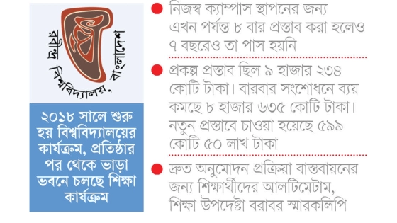 জানা গেছে, নিজস্ব ক্যাম্পাস স্থাপনের জন্য ২০১৮ সালের ডিসেম্বরে প্রথম প্রকল্প প্রস্তাব করে বিশ্ববিদ্যালয় কর্তৃপক্ষ। ৯ হাজার ২৩৪ কোটি টাকা ব্যয়ে প্রকল্প প্রস্তাবটি ফেরত দিয়ে ব্যয় এবং আকার কমানোর সুপারিশ করা হয়। পরে আরও ৫ বার প্রস্তাব করা হলেও অনুমোদন না দিয়ে সংশোধনের জন্য একইভাবে ফেরত দেওয়া হয়। এ সময়ের মধ্যে প্রকল্পের আকার ও ব্যয় কমানো ছাড়া দৃশ্যমান কোনো অগ্রগতি হয়নি।