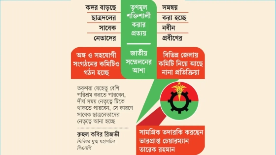 তৃণমূলে মজবুত সংগঠন বিষয়ে জানতে চাইলে বিএনপির সিনিয়র যুগ্ম মহাসচিব রুহুল কবির রিজভী কালবেলাকে বলেন, ‘দেশ ও জাতি গঠনে তরুণদের ভূমিকা অনস্বীকার্য। তাদের ভূমিকা অতুলনীয়। ভবিষ্যৎ রাজনীতিতে নেতৃত্ব দেওয়ার ক্ষেত্রে তরুণদের এগিয়ে আসার পথ খোলা রাখতে হবে। তাদের সুযোগ বৃদ্ধি করতে হবে। তরুণদের মধ্যে যারা দক্ষ, যোগ্য, ত্যাগী এবং আন্দোলন-সংগ্রামের মধ্য দিয়ে উঠে এসেছে, তারা এরই মধ্যে নিজের নেতৃত্ব প্রতিষ্ঠা করেছে। এ কারণে তাদের সুযোগটা আরও বাড়ানো উচিত। অবশ্য দল পরিচালনায় নবীন-প্রবীণের সমন্বয় জরুরি। গুরুত্বপূর্ণ পদে তরুণদের এগিয়ে নেওয়ার কারণ হলো যাতে তাদের কাছ থেকে ভালো সেবা পাওয়া যায়। অপেক্ষাকৃত তরুণরা যেহেতু বেশি পরিশ্রম করতে পারবেন, দীর্ঘ সময় নেতৃত্বে টিকে থাকতে পারবেন, সে কারণে সাবেক ছাত্রনেতাদের নেতৃত্বে আনা হচ্ছে।’