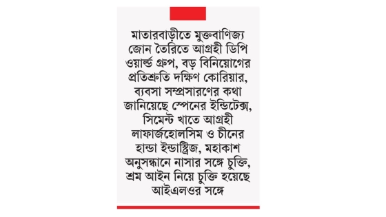 বাংলাদেশে বড় বিনিয়োগের প্রতিশ্রুতি দিয়েছে সফররত দক্ষিণ কোরিয়ার ব্যবসায়ী প্রতিনিধিদল। বাংলাদেশে ব্যবসা সম্প্রসারণের কথা জানিয়েছে স্পেনের খুচরা বিক্রেতা প্রতিষ্ঠান ইন্ডিটেক্স, সিমেন্ট খাতের কোম্পানি লাফার্জহোলসিম ও চীনের অ্যাপারেল কোম্পানি হান্ডা ইন্ডাস্ট্রিজ। বাংলাদেশ সফররত যুক্তরাজ্যের বাণিজ্য দূত ব্যারোনেস রোজি উইন্টারটন দেশের স্বাস্থ্যসেবা ও শিক্ষা খাতে প্রশিক্ষণ, প্রযুক্তি বিনিময় ও দীর্ঘমেয়াদি অংশীদারত্বের বিষয়ে আগ্রহ প্রকাশ করেছেন।