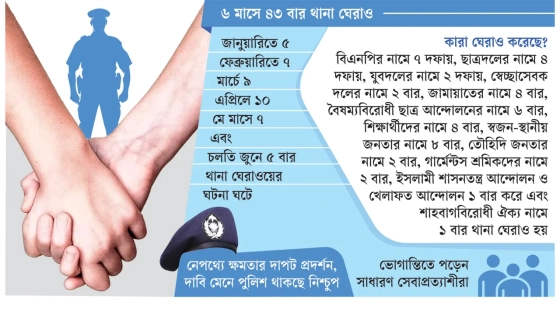 জুনে পাঁচবার থানা ও পুলিশ স্থাপনা ঘেরাও: চলতি মাসের ২৫ জুন পর্যন্ত দেশে অন্তত পাঁচবার থানা ও পুলিশ স্থাপনা ঘেরাওয়ের মতো ঘটনা ঘটেছে। এর মধ্যে গত মঙ্গলবার খুলনা মেট্রোপলিটন পুলিশের (কেএমপি) কার্যালয় ঘেরাওয়ের পর মূল ফটকে তালা ঝুলিয়ে ব্যাপক বিক্ষোভ করেন বিএনপির নেতাকর্মীরা। গত ২০ জুন চাঁদাবাজির একটি মামলায় গ্রেপ্তার হওয়া ইসলামী আন্দোলনের নেতাকে ছাড়িয়ে নিতে চান্দগাঁও থানা ঘেরাও করেন দলটির নেতাকর্মীরা। পরদিন পুলিশ ওই নেতাকে আদালতে না পাঠিয়ে ছেড়ে দিতে বাধ্য হয়। এর আগের দিন নামের ভুলে লালমনিরহাটের হাতীবান্ধা উপজেলা স্বেচ্ছাসেবক দলের নেতা খন্দকার নূরনবী কাজলকে পুলিশ গ্রেপ্তার করলে তাকে ছাড়াতে থানা ঘেরাও করেন সংগঠনটির নেতাকর্মীরা। ঢাকা মহানগর পুলিশের তুরাগ থানায় পদায়ন করা হয়েছিল এস এম শাহাদাত হোসেন নামে এক ইন্সপেক্টরকে। তবে গত ১৭ জুন তার যোগ দেওয়া ঠেকাতে বৈষম্যবিরোধী ছাত্র আন্দোলনের নামে নেতাকর্মীরা থানার গেটে বিক্ষোভ করেন।