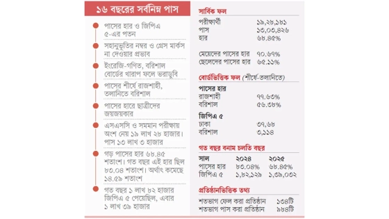 গত ১৬ বছরে সবচেয়ে কম পাসের হার: ২০২৫ সালের এসএসসি ও সমমানের পরীক্ষায় পাসের হার গত ১৬ বছরের মধ্যে সবচেয়ে কম। এ বছর গড় পাসের হার ৬৮ দশমিক ৪৫ শতাংশ। করোনাকালে অনুষ্ঠিত ২০২০ সালের পরীক্ষায় শতভাগ পাসের হার থাকলেও (সেই বছর পরীক্ষা হয়নি, মূল্যায়ন ছিল অন্যভাবে), সেটি বাদ দিলে বাকি সব বছরের তুলনায় এ বছরের পাসের হার সবচেয়ে নিচে। ২০১০ থেকে ২০২৫ সালের মধ্যে কেবল ২০১৮ সালে পাসের হার ৭০ শতাংশের নিচে ছিল। বাকি বছরগুলোতে গড় পাসের হার ছিল ৮০ শতাংশের ওপরে। এমনকি ২০১৪ ও ২০২১ সালে পাসের হার ৯০ শতাংশ ছাড়িয়ে যায়।
