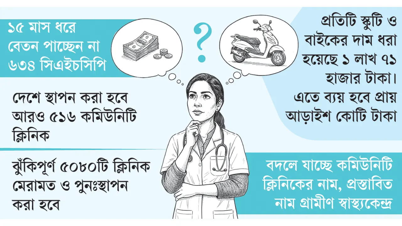 ১৫ মাস ধরে বেতন পাচ্ছেন না কমিউনিটি ক্লিনিকে কর্মরত ৬৩৪ জন কমিউনিটি হেলথ কেয়ার প্রোভাইডার (সিএইচসিপি)। অথচ সারা দেশে কর্মরত সাড়ে ১৪ হাজার নারী ও পুরুষ সিএইচসিপির জন্য বাইক ও স্কুটি কেনার ‘বিলাসী’ প্রস্তাব করা হয়েছে। এসব বাইক-স্কুটি কেনায় ব্যয় ধরা হয়েছে আড়াইশ কোটি টাকা।