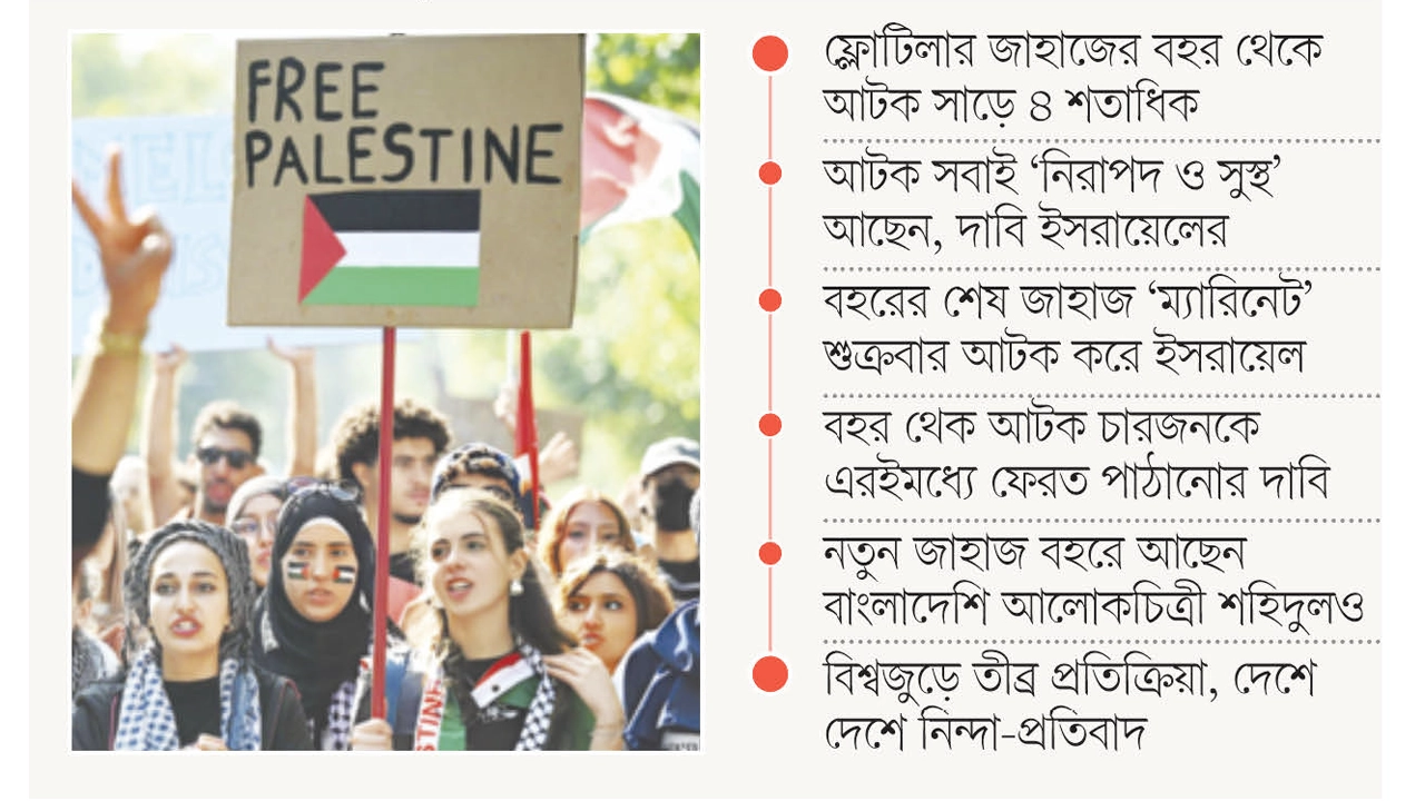 দেশে নিন্দার ঝড়, প্রতিবাদ: গাজামুখী ত্রাণবহরে ইসরায়েলি হামলা এবং জাহাজ ও আরোহী অধিকারকর্মীদের আটকের ঘটনায় আন্তর্জাতিক সম্প্রদায়ের মধ্যে তীব্র ক্ষোভের সৃষ্টি হয়েছে। বিভিন্ন দেশের সরকার এবং মানবাধিকার সংস্থাগুলো ইসরায়েলের এই কর্মকাণ্ডের কঠোর নিন্দা জানিয়েছে। জাতিসংঘের মানবাধিকারবিষয়ক হাইকমিশনার ভলকার টুর্ক ইসরায়েলকে ‘অবিলম্বে গাজার অবরোধ তুলে নিতে’ এবং মানবিক সহায়তার প্রবেশাধিকার দিতে আহ্বান জানিয়েছেন। যুক্তরাজ্য, আয়ারল্যান্ড, স্পেন ও বেলজিয়ামের মতো দেশগুলো তাদের নাগরিকদের আটকের বিষয়ে উদ্বেগ প্রকাশ করে ইসরায়েলি কর্তৃপক্ষকে দ্রুত ও নিরাপদে পরিস্থিতি সমাধানের আহ্বান জানিয়েছে।