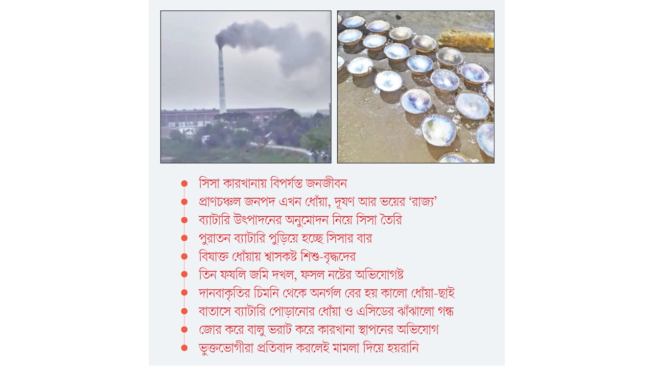 এলাকা ঘুরে দেখা যায়, কারখানায় পুরোনো ব্যাটারি পুড়িয়ে সিসা তৈরি করার সময় বিষাক্ত কালো ধোঁয়া চারদিকে ছড়িয়ে পড়ছে, নিঃশ্বাসে ভেসে আসে ঝাঁজালো গন্ধ। কারখানার আশপাশের বাড়ির টিনের তৈরি ঘরগুলোর ভেতরে কালো দাগ পড়ে গেছে। কারখানা থেকে নির্গত বিষাক্ত ও ক্ষতিকারক রাসায়নিক পদার্থ ফসলি জমি ও খাল বেয়ে সরাসরি বিলে যাচ্ছে। প্রতিষ্ঠার পর থেকেই এই কারখানা ফসলি জমি থেকে শুরু করে শুধু নদী-খালের পানিই বিষাক্ত করছে না, বয়স্ক মানুষের স্বাভাবিক শ্বাস-প্রশ্বাসেও বড় অন্তরায় হয়ে দাঁড়িয়েছে।