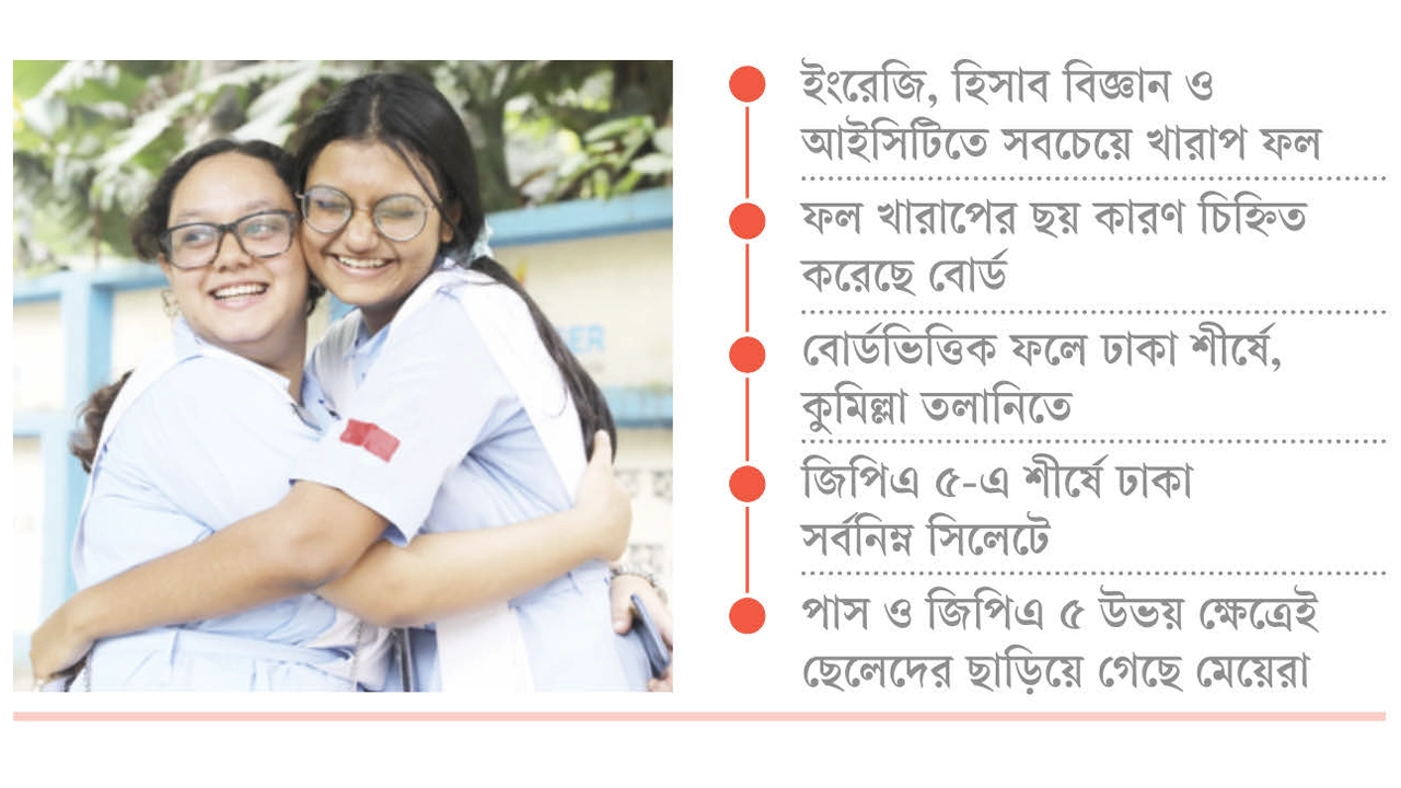 ফল বিশ্লেষণে দেখা গেছে, এ বছর প্রায় ৪৩ শতাংশ পরীক্ষার্থী পাস করতে পারেননি। শুধু পাসের হার নয়, জিপিএ ৫ পাওয়া শিক্ষার্থীর সংখ্যাও বিপুল পরিমাণে কমেছে। গত বছর জিপিএ ৫ পেয়েছিলেন ১ লাখ ৩১ হাজার ৩৭৬ জন। তার আগের বছর পেয়েছিলেন ৭৮ হাজার ৫২১ জন। এ বছর সেই সংখ্যা নেমে এসেছে ৬৩ হাজার ২১৯ জনে।