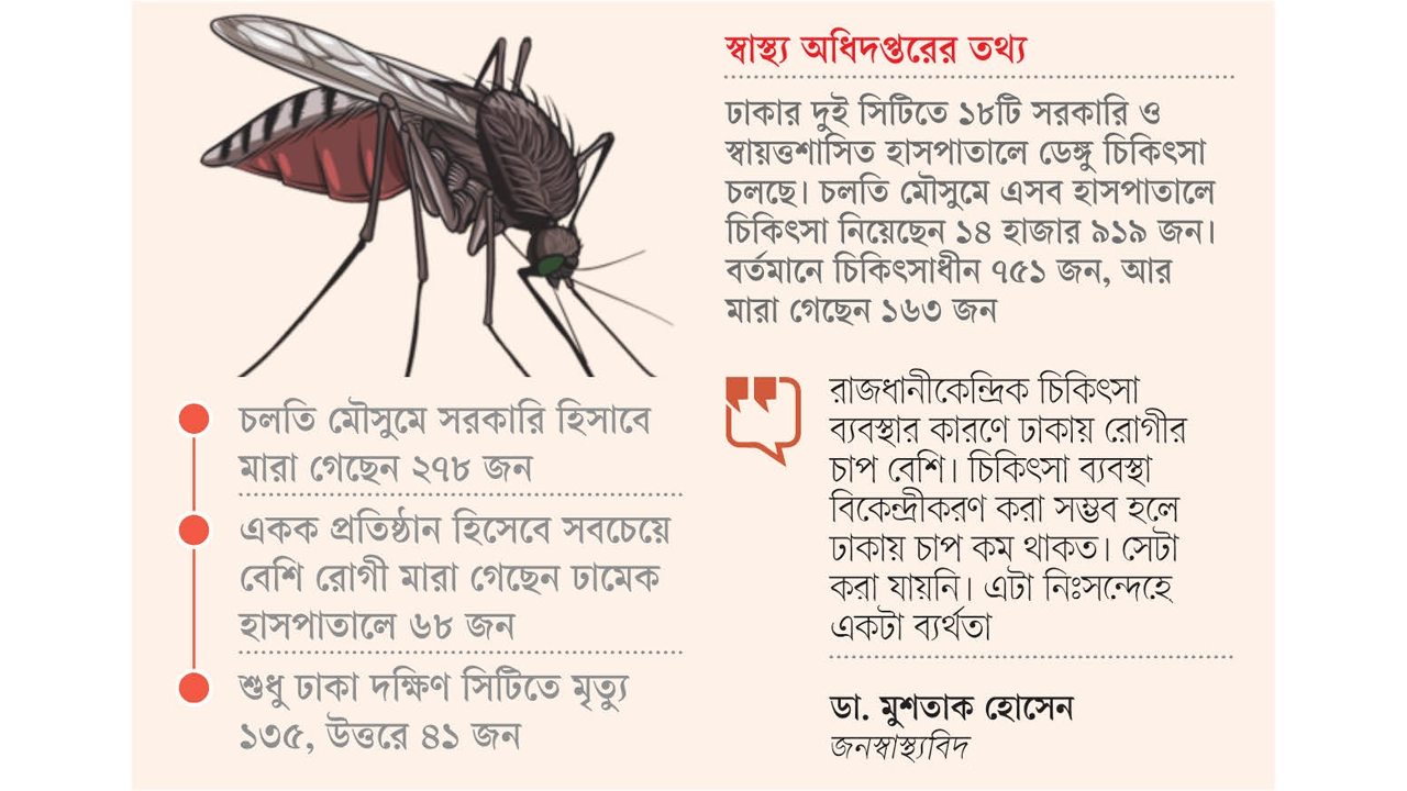 স্বাস্থ্য অধিদপ্তরের তথ্য অনুযায়ী, ঢাকার দুই সিটিতে ১৮টি সরকারি ও স্বায়ত্তশাসিত হাসপাতালে ডেঙ্গু চিকিৎসা চলছে। চলতি মৌসুমে এসব হাসপাতালে চিকিৎসা নিয়েছে ১৪ হাজার ৯১৯ জন। বর্তমানে চিকিৎসাধীন ৭৫১ জন, আর মারা গেছেন ১৬৩ জন।