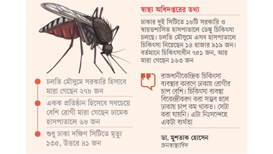 রোগতত্ত্ব, রোগ নিয়ন্ত্রণ ও গবেষণা ইনস্টিটিউটের (আইইডিসিআর) উপদেষ্টা এবং জনস্বাস্থ্যবিদ ডা. মুশতাক হোসেন বলেন, ‘রাজধানীকেন্দ্রিক চিকিৎসা ব্যবস্থার কারণে ঢাকায় রোগীর চাপ বেশি। চিকিৎসা ব্যবস্থা বিকেন্দ্রীকরণ করা সম্ভব হলে ঢাকায় চাপ কম থাকত। সেটা করা যায়নি। এটা নিঃসন্দেহে একটা ব্যর্থতা।’