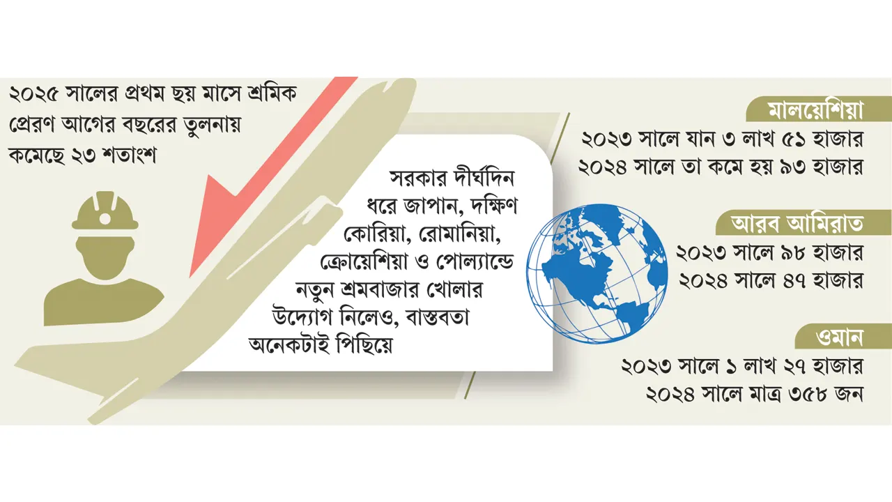 প্রবাসী কল্যাণ মন্ত্রণালয়ের তথ্য অনুযায়ী, ২০২৫ সালের প্রথম ছয় মাসে বিদেশে শ্রমিক প্রেরণ আগের বছরের তুলনায় কমেছে ২৩ শতাংশ।
