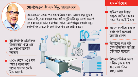 কোনোটির দাম বাজারদরের চেয়ে শতগুণ বেশি, কোনোটি আবার আট-দশ গুণ। দরপত্রে নির্দিষ্ট দেশে তৈরি হওয়ার শর্ত থাকলেও নিম্নমানের পণ্যের গায়ে ওই দেশের ট্যাগ লাগিয়ে সরবরাহ করা হতো। অনেক ক্ষেত্রে কাজ না করেই তুলে নেওয়া হতো বিল। স্বজনদের নামে বিভিন্ন কোম্পানি খুলে একাই নিয়ন্ত্রণ করতেন স্বাস্থ্য খাতের কেনাকাটা। আর এসব যাদের দেখভাল করার কথা, তারা যেন অনেকটাই থাকতেন আড়ালে। বিল ছাড় করতে পারলেই যেন বেঁচে যেতেন। দীর্ঘদিন ধরেই এই চিত্র বিরাজ করছিল স্বাস্থ্য খাতের কেনাকাটায়—যার একচ্ছত্র নিয়ন্ত্রক ছিলেন মোতাজ্জেরুল ইসলাম মিঠু। করোনাকালে একের পর এক অনিয়ম সামনে আসায় বছর দুয়েক অনেকটা আড়ালে ছিলেন। তবে স্বাস্থ্যের কেনাকাটায় লুটপাটের মূল হোতা সম্প্রতি আবার সরব হয়েছেন। আগের প্রতিষ্ঠান কালো তালিকাভুক্ত হওয়ায় নতুন কোম্পানির মাধ্যমে নিয়ন্ত্রণ ফিরে পাওয়ার চেষ্টা করছেন বলে সংশ্লিষ্টরা জানিয়েছেন।