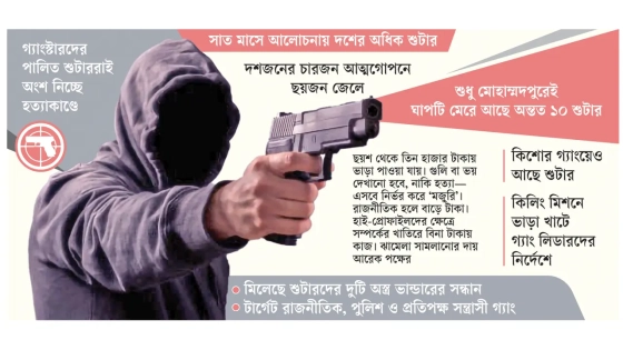 শুধু গত দেড় মাসের মধ্যেই অন্তত চারবার এই শুটারদের ভয়ংকর রূপ দেখেছে মানুষ। এর মধ্যে গত নভেম্বরে চট্টগ্রামে বিএনপি মনোনীত সংসদ সদস্য (এমপি) প্রার্থীর গণসংযোগের মধ্যেই গুলি করে দুর্ধর্ষতার জানান দেয় অস্ত্রধারী। একই মাসে শুটারের আগ্নেয়াস্ত্রের নির্ভুল নিশানায় রাজধানীর পল্লবীতে প্রাণ যায় যুবদল নেতার। পুরান ঢাকায় শুটারের নিখুঁত নিশানায় প্রাণ যায় আরেক তালিকাভুক্ত সন্ত্রাসীর। এর আগে আলাদা দুই ঘটনায় শুটারদের নিশানায় পরিণত হয়ে গুলিবিদ্ধ হন পুলিশের ৩ সদস্য। সর্বশেষ গত শুক্রবার ঢাকা-৮ আসনের সম্ভাব্য স্বতন্ত্র প্রার্থী ও ইনকিলাব মঞ্চের মুখপাত্র শরিফ ওসমান হাদি দক্ষ এক শুটারের অস্ত্রের নিশানায় পড়েন। যে ঘটনা দেশের আইনশৃঙ্খলার নড়বড়ে চিত্রের সঙ্গে অস্ত্রধারী শুটারদের ভয়ংকর রূপ সামনে নিয়ে আসে।