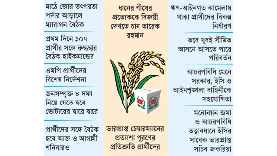 দিনভর চলা এই বৈঠকে বিএনপির এমপি প্রার্থীদের ভোটের মাঠে করণীয় এবং প্রচার-প্রচারণা, মনোনয়ন ফরম সংগ্রহ-পূরণ, জমাদানসহ বিভিন্ন বিষয়ে গুরুত্বপূর্ণ দিকনির্দেশনা দেওয়া হয় বলে জানা গেছে। বিশেষ করে নির্বাচনে জিততে রাষ্ট্র কাঠামো মেরামতের ৩১ দফা এবং জনসম্পৃক্ত অতিগুরুত্বপূর্ণ ৮ দফা নিয়ে ভোটারদের দ্বারে দ্বারে যাওয়ার নির্দেশনা দেওয়া হয়েছে। বিএনপি রাষ্ট্র ক্ষমতায় গেলে পূর্বঘোষিত পরিকল্পনাগুলো কীভাবে বাস্তবায়ন করা হবে, সেসব বিষয়ে আরও সহজভাবে মানুষের মাঝে তুলে ধরতে বলা হয়েছে। সেইসঙ্গে মনোনীত প্রার্থীদের কাছ থেকে ৫৫ হাজার টাকা করে দলীয় মনোনয়ন ফি জমা নেওয়া হয়েছে। অর্থাৎ গতকাল শুরু হওয়া বৈঠকের মূল বার্তা হলো—তারেক রহমান দেশে ফেরার আগেই যেন প্রতিটি নির্বাচনী এলাকায় সাংগঠনিক শক্ত ভিত্তি তৈরি হয়, সে লক্ষ্যেই এই আগাম প্রস্তুতি। বৈঠকে তারেক রহমান বলেছেন, তিনি ধানের শীষ প্রতীকে মনোনীত প্রত্যেককেই সংসদ সদস্য হিসেবে দেখতে চান। আর এজন্য তিনি ফুলের মালা নিয়ে অপেক্ষায় থাকবেন। ধানের শীষের সবাইকে বিজয়ী হওয়ার কোনো বিকল্প নেই। এ ছাড়া ভারপ্রাপ্ত চেয়ারম্যান তারেক রহমান নির্বাচনী আচরণবিধি মেনে চলার জন্য সবার প্রতি আহ্বান জানিয়েছেন। তিনি বলেছেন, দলমত নির্বিশেষে সবাইকে কাজ করতে হবে। সবাইকে নির্বাচনী আচরণবিধি মেনে চলে সরকার, নির্বাচন কমিশন ও আইনশৃঙ্খলা বাহিনীকে সহযোগিতা করতে হবে। এক কথায়, নির্বাচনকে অর্থবহ করে তুলতে হবে এবং বিএনপির বিজয় নিশ্চিত করতে হবে। এ সময় উপস্থিত প্রার্থীরাও দলের ভারপ্রাপ্ত চেয়ারম্যানের প্রত্যাশা পূরণে কাজ করছেন বলে জানান।