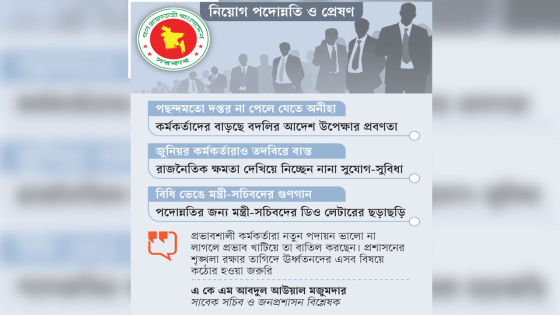 তিনি আরও বলেন, ‘জনপ্রশাসনের আদেশ কার্যকর করতে না পারলে চেইন অব কমান্ড ভেঙে পড়ে। আদেশ জারির পর তা বাতিল করা খুবই খারাপ নজির। এই সংস্কৃতি আগে ছিল না। সম্প্রতি এ প্রবণতা বেড়েছে। প্রভাবশালী কর্মকর্তারা নতুন পদায়ন ভালো না লাগলে প্রভাব খাটিয়ে তা বাতিল করছেন। প্রশাসনের শৃঙ্খলা রক্ষার তাগিদে ঊর্ধ্বতনদের এসব বিষয়ে কঠোর হওয়া জরুরি।’