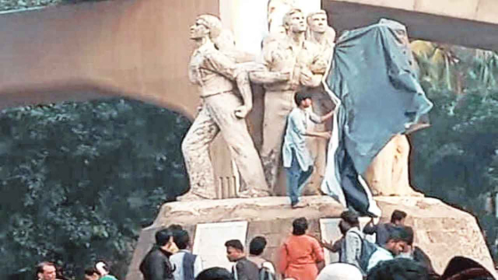 ঢাকা বিশ্ববিদ্যালয়ের (ঢাবি) সন্ত্রাসবিরোধী রাজু ভাস্কর্য থেকে কালো কাপড় সরিয়ে দিয়েছে ছাত্র ইউনিয়নের নেতাকর্মীরা। প্রগতিশীল ছাত্রজোটের বিরুদ্ধে প্রধানমন্ত্রীর ছবি সংবলিত বিলবোর্ড ভাঙচুরের অভিযোগে ১২ ডিসেম্বর ভাস্কর্যটি কালো কাপড়ে ঢেকে দিয়েছিল ছাত্রলীগ।