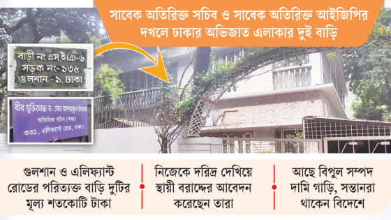 দুটি বাড়ির অবস্থান রাজধানী ঢাকার দুই অভিজাত এলাকায়। একটির অবস্থান গুলশানে। আরেকটি এলিফ্যান্ট রোডে। দূরত্ব অনেক হলেও এই দুই বাড়ি ঘিরে ঘটছে একই রকম ঘটনা। অবৈধভাবে দখল করে বসবাস করছেন সরকারের সাবেক দুই কর্মকর্তা। একজন জনপ্রশাসনের, আরেকজন পুলিশের। একজন অবসরপ্রাপ্ত অতিরিক্ত সচিব ড. মো. আশরাফুল ইসলাম, আরেকজন সাবেক অতিরিক্ত মহাপরিদর্শক (অ্যাডিশনাল আইজিপি) মো. শামসুজ্জোহা খন্দকার। শতকোটি টাকার বাড়ি দুটি শুধু দখলে রেখেই ক্ষান্ত হননি দুই কেউকেটা, নিজেদের ‘গরিব’ দাবি করে এগুলো স্থায়ীভাবে বরাদ্দ চেয়েছেন তারা।