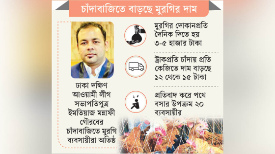 তিনি বলেন, ‘আমরা বরাবরই চাঁদা দিয়ে ব্যবসা করে আসছি। বাজারে মুরগির দাম বাড়ে না; কিন্তু দাম বাড়ায় এখানকার চাঁদাবাজরা। চাঁদা আদায়কে কেন্দ্র করে ওয়ার্ড কাউন্সিলরের লোকজনের সঙ্গে প্রায়ই সংঘর্ষের ঘটনা ঘটে।’