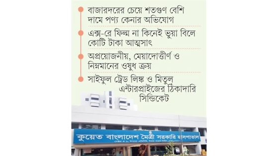 রাজধানীর উত্তরা এবং আশপাশের এলাকার গরিব ও মধ্যবিত্ত মানুষের চিকিৎসা গ্রহণে মূল ভরসা কুয়েত-বাংলাদেশ মৈত্রী হাসপাতাল। অথচ এই হাসপাতাল ঘিরে চলছে সীমাহীন অনিয়ম আর দুর্নীতির মহোৎসব। এর মধ্যে দন্ত ও প্যাথলজি বিভাগের জরুরি পণ্য কেনাকাটায় বড় ধরনের লুটপাট হয়েছে। দাঁতের রুট ক্যানেলের পর ফিলিং করতে সিলভার অ্যালয় নামে এক ধরনের ধাতবের প্রয়োজন হয়। বিদেশ থেকে আমদানি করা ৩০ গ্রাম সিলভার অ্যালয়ের বাজারদর আড়াই থেকে ৩ হাজার টাকা। কিন্তু কুয়েত-মৈত্রী হাসপাতালের জন্য সেই পণ্য কেনা হয়েছে লাখ টাকায়। এখানেই শেষ নয়; ২০০ টাকার টেম্পারেচার চার্ট হোল্ডার কেনা হয় সাড়ে ৫ হাজার টাকায়। কয়েক গুণ দামে হলেও এসব পণ্য তবু কেনা হয়েছে, এক্স-রে ফিল্ম না কিনেই ভুয়া বিল করে কোটি টাকা আত্মসাৎ করা হয়েছে। এ ছাড়া প্রচার ও বিজ্ঞাপন খাতের টাকা লোপাট হয় ভুয়া সাইনবোর্ডের নামে। মেয়াদোত্তীর্ণ ও নিম্নমানের অপ্রয়োজনীয় ওষুধ ক্রয়সহ কেনাকাটায় রয়েছে আরও নানা অনিয়মের অভিযোগ। এসব অভিযোগের আঙুল উঠেছে হাসপাতালের সাবেক তত্ত্বাবধায়ক ও বর্তমান সহকারী পরিচালক (প্রশাসন) ডা. মাহফুজ আরা বেগম এবং শিশু বিভাগের আবাসিক ফিজিশিয়ান (আরপি) ডা. মো. ইমরুল হাসানের বিরুদ্ধে।