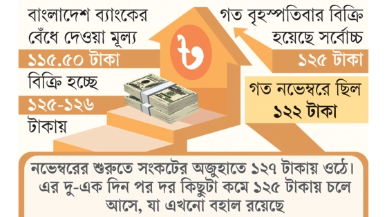 গত বৃহস্পতিবার খোলা বাজারে সর্বোচ্চ ১২৫ টাকায় ডলার বিক্রি হয়েছে। গত নভেম্বরে ছিল ১২২ টাকা। এর আগে দীর্ঘদিন ১১৯ থেকে ১২০ টাকায় খোলাবাজারে ডলারের দর স্থিতিশীল থাকলেও নভেম্বরের শুরুতে ডলার সংকটের অজুহাতে এই দর ১২৭ টাকায় ওঠে। এর দু-এক দিন পর দর কিছুটা কমে ১২৫ টাকায় চলে আসে, যা এখনো বহাল রয়েছে। অর্থাৎ উচ্চমূল্যে স্থিতিশীল রয়েছে ডলারের দর।