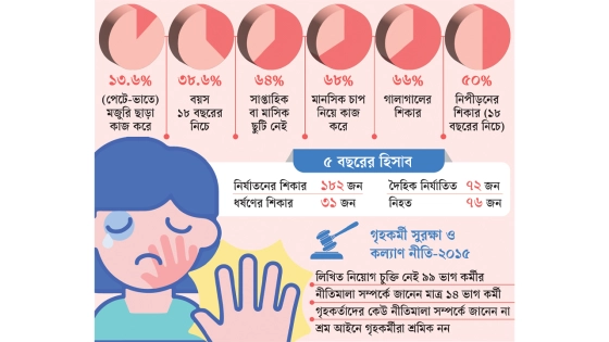 মানবাধিকার সংগঠন আইন ও সালিশ কেন্দ্র (আসক) প্রকাশিত গত ৫ বছরের পরিসংখ্যান বিশ্লেষণ করে দেখা যায়, ২০১৯ সাল থেকে ২০২৩ সালের ডিসেম্বর পর্যন্ত সারা দেশে ১৮২ গৃহকর্মী কর্মস্থলে নির্যাতনের শিকার হয়েছে। তাদের মধ্যে দৈহিক নির্যাতনের শিকার ৭২ জন। ধর্ষণের শিকার ৩১ জন এবং ওই সময়ের মধ্যে নিহত হয়েছে ৭৬ জন। আসকের পরিসংখ্যানে দেখা যায়, ১৩ থেকে ১৮ বছর বয়সী গৃহকর্মীরা নির্যাতনের শিকার বেশি হচ্ছেন। তবে এসব ঘটনার কোনোটিতেই বিচার পায়নি ভুক্তভোগী পরিবার।
