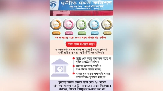 গত এক বছরে অধস্তন আদালতে দুর্নীতির মামলায় সাজার হার প্রায় ৪ শতাংশ কমেছে। এই সময়ে ৩৪১টি দুর্নীতি মামলা নিষ্পত্তি হয়েছে। এর মধ্যে ৫৭ দশমিক ১৮ শতাংশ মামলায় সাজা পেয়েছেন অভিযুক্তরা। বিগত পাঁচ বছরের দুদকের দেওয়া চিত্র বিশ্লেষণে দেখা গেছে, ২০১৯ সালের পর থেকে সাজার এই হার গত বছর ছিল সর্বনিম্ন। পাশাপাশি কমেছে মামলা নিষ্পত্তির সংখ্যাও। বিচার প্রক্রিয়ায় দীর্ঘসূত্রতাসহ নানা কারণে ৪০ শতাংশের বেশি দুর্নীতির মামলায় অভিযুক্তরা খালাস পেয়ে যাচ্ছে বলে মনে করেন বিশেষজ্ঞরা।