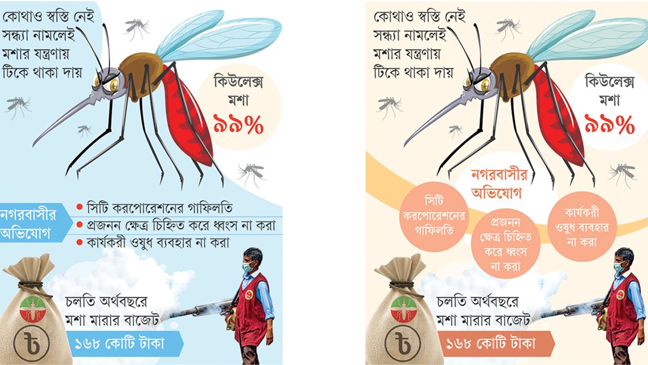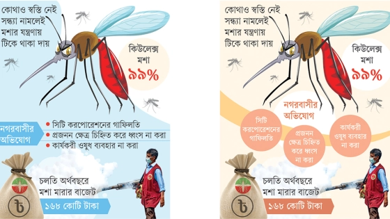 ‘মশা মারতে কামান দাগা’ প্রবাদটি যেন ঢাকার দুই সিটি করপোরেশনের জন্য সত্যি হয়ে ধরা দিয়েছে। চলতি অর্থবছরে মশা মারার বাজেট ১৬৮ কোটি টাকা। মশা মারতে ড্রোন, রোড শো, পরিচ্ছন্নতা ও মশককর্মীদের শরীরে অত্যাধুনিক বডি ক্যামেরার সংযোজন, বিটিআই নামের ব্যাকটেরিয়া আমদানি এবং হাঁস, পাখি, গাছ ও মাছের ব্যবহার হয়েছে। কিছুতেই মশার দাপট কমছে না। উল্টো গত চার মাসে রাজধানী ও আশপাশের এলাকায় কিউলেক্স মশার ঘনত্ব দ্বিগুণ হয়েছে। সাম্প্রতিক এক গবেষণায় এই তথ্য উঠে এসেছে।