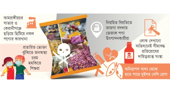 এদিকে নামিদামি ব্র্যান্ডের মোড়কে ভেজাল ও নকল পণ্য কিনে প্রতিনিয়ত প্রতারিত হচ্ছেন ভোক্তারা। ভেজাল খাদ্যের প্রভাবে মানবদেহে দেখা দিচ্ছে নানা ধরনের রোগ। বিশেষ করে এসব ভেজাল পণ্যে শিশুরা মারাত্মক স্বাস্থ্যঝুঁকিতে রয়েছে বলে জানিয়েছেন জনস্বাস্থ্যবিদরা। একটি বেসরকারি সংস্থার তথ্যমতে, অনিরাপদ খাদ্য থেকে মানবদেহে দুইশর বেশি অসুখ হতে পারে।