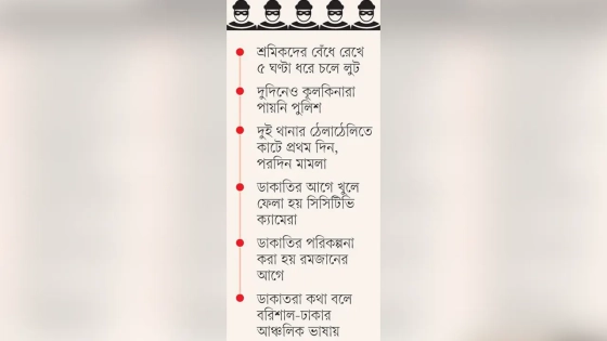 হাফিজুর রাসেল নামের আরেক শ্রমিক বলেন, ‘ইফতারের সময় কোনো কিছু বুঝে ওঠার আগেই হঠাৎ করে ডাকাত দল এসে আমাদের হাত-পা বেঁধে ফেলে। তারা সবাই সুঠাম দেহের অধিকারী এবং মুখে মাস্ক পরা ছিল। সব ডাকাত একজনকে স্যার স্যার বলে ডাকছিল।’