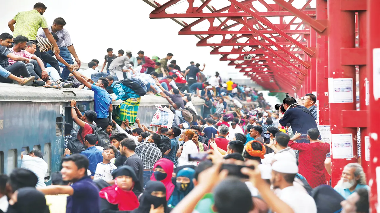 সন্ধ্যার আগেই পায়ে পায়ে মানুষের স্রোত টার্মিনালের দিকে। ঘরে ফেরা মানুষের ঢল নামে সবখানেই। নৌ-সড়ক-রেলপথ কোথাও ঠাঁই নেই। সবখানে ভিড়। মানুষ আর মানুষ। পথে পথে যানবাহনের জন্য দীর্ঘ অপেক্ষা। গুরুত্বপূর্ণ মহাসড়কগুলোতে বিকেল থেকেই যানবাহনের চাপ বাড়ে। সন্ধ্যার আগেই ঢাকা-ময়মনসিংহ, ঢাকা-টাঙ্গাইল, সাভার, ঢাকা-সিলেট ও ব্রাহ্মণবাড়িয়া সড়কে যানজটের সৃষ্টি হয়। তবে নানা ভোগান্তি, ঝক্কিঝামেলা মাথায় নিয়ে শেষ পর্যন্ত আনন্দ নিয়ে, হাসিমুখে বাড়ি ফিরেছেন নগরবাসী।