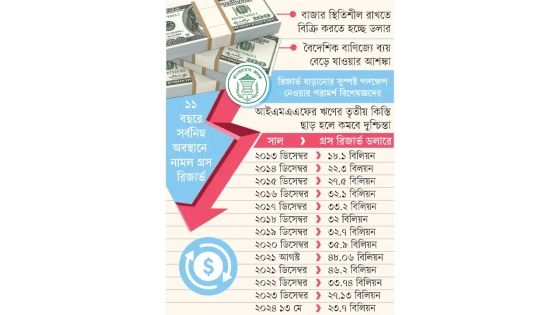 তথ্য বলছে, বাজারের নিয়ন্ত্রণ রাখতে ডলার বিক্রি, আমদানি ব্যয়ের সঙ্গে তাল মিলিয়ে রপ্তানি ও রেমিট্যান্স না বাড়া এবং বিদেশি ঋণের সুদ ও আসল পরিশোধের হার বেড়ে যাওয়ায় রিজার্ভের ওপর চাপ তৈরি হয়েছে। চলতি অর্থবছর এ পর্যন্ত বাংলাদেশ ব্যাংক রিজার্ভ থেকে প্রায় ১২ বিলিয়ন ডলার বিক্রি করেছে। আর সরকারি ও সরকারি প্রতিষ্ঠানের বিদেশি ঋণ পরিশোধ করতে হয়েছে প্রায় ১ বিলিয়ন ডলার। আগামী ডিসেম্বর পর্যন্ত আরও ১ দশমিক ৬২ বিলিয়ন ডলার ঋণ পরিশোধ করতে হবে। এর বাইরে বেসরকারি খাতের বিদেশি ঋণ পরিশোধের চাপও রয়েছে।