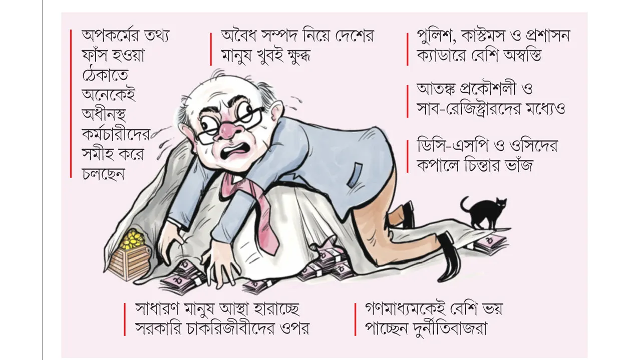 পুলিশের সাবেক মহাপরিদর্শক (আইজিপি) বেনজীর আহমেদ এবং জাতীয় রাজস্ব বোর্ডের (এনবিআর) কর্মকর্তা মতিউর রহমানের বিপুল পরিমাণ অবৈধ সম্পদের তথ্য সামনে আসায় সরকারের বিভিন্ন দপ্তরের দুর্নীতিবাজ কর্মকর্তা-কর্মচারীরা এখন আতঙ্কে আছেন। কখন কার আমলনামা গণমাধ্যমে উঠে আসে—সেই আশঙ্কায় দিন কাটছে তাদের। অপকর্মের তথ্য ফাঁস হওয়া ঠেকাতে অনেকেই অধীনস্থ কর্মচারীদের সমীহ করে চলছেন। পুলিশ, কাস্টমস ও প্রশাসনের পাশাপাশি প্রকৌশল সম্পর্কিত বিভিন্ন ক্যাডারেও এমন পরিস্থিতি বিরাজ করছে বলে জানা গেছে।