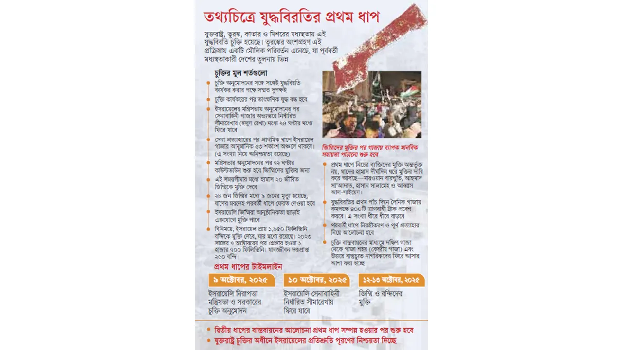 গাজার ফিলিস্তিনিরা স্থায়ী যুদ্ধবিরতির আশায় রয়েছেন। তবে যুদ্ধবিরতি কার্যকর হওয়ার পরও তারা নিজেদের শহর, গ্রাম পুনর্গঠনের দীর্ঘ ও জটিল পথেই থাকবেন। আর তাদের স্বাভাবিক জীবনে ফেরাও হবে কষ্টকর। এখন গাজাকে বাসযোগ্য করাই সবচেয়ে বড় চ্যালেঞ্জ। জাতিসংঘের হিসাব অনুযায়ী, গাজা পুনর্গঠনের জন্য ৫০ বিলিয়ন ডলারের বেশি খরচ হবে। আর পুরো উপত্যকাকে ফের বাসযোগ্য করতে কমপক্ষে ১৫ বছর সময় লাগতে পারে।