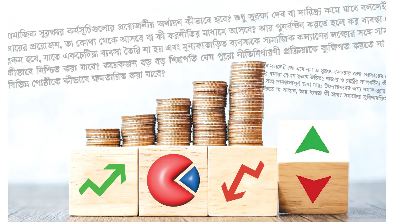 সামাজিক সুরক্ষার কর্মসূচিগুলোর প্রয়োজনীয় অর্থায়ন কীভাবে হবে? শুধু সুরক্ষা দেব বা দারিদ্র্য কমে যাবে বললেই তো হবে না। এ সুরক্ষা দেওয়ার জন্য সরকারের যে আয়ের প্রয়োজন, তা কোথা থেকে আসবে বা কী করনীতির মাধ্যমে আসবে? আয় পুনর্বণ্টন করতে হলে কর ব্যবস্থা কেমন হওয়া উচিত? বাজার ও রাষ্ট্রের সম্পর্কইবা কী-রকম হবে, যাতে একচেটিয়া ব্যবসা তৈরি না হয় এবং মুনাফাতাড়িত ব্যবসাকে সামাজিক কল্যাণের লক্ষ্যের সঙ্গে সামঞ্জস্যপূর্ণ রাখা যায়? উদ্যোক্তাদের জন্য সমান সুযোগ কীভাবে নিশ্চিত করা যাবে? কয়েকজন বড় বড় শিল্পপতি যেন পুরো নীতিনির্ধারণী প্রক্রিয়াকে কুক্ষিগত করতে না পারেন, তার ব্যবস্থা কী হবে? সমাজের সুবিধাবঞ্চিত বিভিন্ন গোষ্ঠীকে কীভাবে ক্ষমতায়িত করা যাবে?