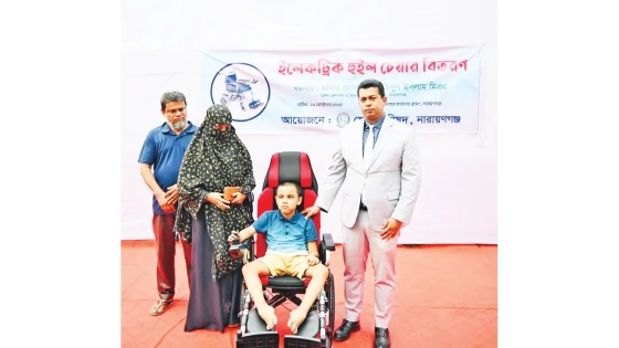 নারায়ণগঞ্জ জেলা প্রশাসক জাহিদুল ইসলাম মিয়া বিরল রোগে আক্রান্ত ৯ বছর বয়সী শিশু মান্তাহার মাহমুদকে অত্যাধুনিক ইলেকট্রিক হুইলচেয়ার উপহার দিয়েছেন। এবার পড়াশোনা চালিয়ে যেতে পারবে মান্তাহার মাহমুদ। মান্তাহারের মা মিতু বেগম আবেগাপ্লুত হয়ে বলেন, ‘ডিসি স্যার তার প্রতিশ্রুতি রেখেছেন। তিনি সত্যিই খুব মানবিক মানুষ। আমরা অনেক খুশি।’ মান্তাহার নিজেও আনন্দে জানাল, ‘এবার আমি মাদ্রাসায় যেতে পারব, সারাক্ষণ মায়ের কোলে থাকতে হবে না।’ শিশুটির পরিবার সূত্রে জানা গেছে, মান্তাহার আগে স্থানীয় সরকারি প্রাথমিক বিদ্যালয়ে পড়ত। পরে খোরশেদ আলম ইসলামিয়া মাদ্রাসায় ভর্তি হয়। হঠাৎ তার শরীরের বিভিন্ন অঙ্গ-প্রত্যঙ্গে সমস্যা দেখা দেয় এবং ধীরে ধীরে হাঁটাচলাও বন্ধ হয়ে যায়। চিকিৎসকরা জানান, শিশুটি Duchenne Muscular Dystrophy (DMD) নামে বিরল রোগে আক্রান্ত। জেলা প্রশাসক নিজে শিশুটির পরিবারকে ডেকে নেন এবং অর্থ সহায়তার পাশাপাশি অত্যাধুনিক হুইলচেয়ার উপহার দেন। এ সময় উপস্থিত ছিলেন অতিরিক্ত জেলা প্রশাসক (সার্বিক) মোহাম্মদ আলমগীর হোসাইনসহ অন্য কর্মকর্তারা।