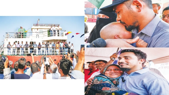 সাগরের জলরাশি থেকে ভেসে আসছে একটি জাহাজ। জাহাজটি তীরের কিছুটা কাছাকাছি আসতেই চারদিকে শুরু হলো চিৎকার। জাহাজটি হাতের নাগালে ভিড়তেই তীরে থাকা স্বজনদের কারও কারও চোখে বেয়ে আসে জল, দীর্ঘদিন পর প্রিয় মুখটাকে দেখে কেউ কেউ বাধা ডিঙিয়ে হাত মেলাতে ছুটে যান জাহাজের কাছে। জাহাজ থেকে প্রিয় মানুষগুলো নেমে আসতেই জড়িয়ে ধরে কান্নায় ভেঙে পড়েন স্বজনরা। নাবিকদের চোখেও বেয়ে আসে নোনা জল। সোমালিয়ার জলদস্যুদের হাতে জিম্মি হওয়ার ৬৫ দিন পর ‘এমভি জাহান মণিতে’ চড়ে যখন ২৩ নাবিক চট্টগ্রামে ফেরেন, তখন দৃশ্যটা ছিল এমনই।