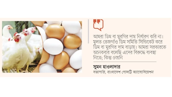 এ বিষয়ে জানতে চাইলে বাংলাদেশ পোলট্রি অ্যাসোসিয়েশনের (বিপিএ) সভাপতি সুমন হাওলাদার কালবেলাকে বলেন, আমরা ডিম বা মুরগির দাম নির্ধারণ করি না। মূলত তেজগাঁও ডিম সমিতি সিন্ডিকেট করে ডিম বা মুরগির দাম বাড়ায়। আমরা সরকারকে অনেকবার বলেছি এদের বিরুদ্ধে ব্যবস্থা নিতে, কিন্তু নেয়নি।