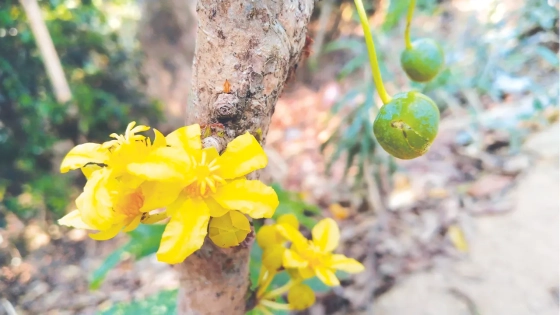 সময়টা চৈত্রের শেষার্ধ। পাহাড়ে হাঁটছিলাম চারপাশের গাছ-ফুল দেখতে দেখতে। শুকনো পাতার মর্মর শব্দের সঙ্গে দূর থেকে ভেসে আসছিল কোকিলের ডাক। কিছু গাছে নতুন পাতা এসেছে, কিছু তখনো পত্রশূন্য। তখনই একটি গাছে কয়েক থোকা হলদে ফুল দেখে থমকে দাঁড়াই। ফুল অনেকটা কমে এসেছে; ফুলের চেয়েও ডালে ডালে তখন পরিণত ফলের প্রাচুর্য। থোকায় থোকায় ধরেছিল সবুজ রঙের ছোট্ট ফল, আকারে বুনোকুলের মতো। মাঝারি আকারের গাছটিতে কোনো পাতা নেই, নিচে ঝরাপাতার মেলা। পাতাও চেনা লাগল, আমার পরিচিত চালতার পাতার মতো, আকারে বেশ বড়। পরে জানলাম গাছটি বনচালতা, চালতারই আত্মীয়। ফুল চালতাফুলের চেয়েও বেশ ছোট, তবে নিবিড়ভাবে খেয়াল করলে গড়নে বেশ সাদৃশ্য চোখে পড়ে। হলুদ রঙের পাপড়ির মাঝখানে সোনালি পুংকেশরের কেন্দ্রে তারার মতো ছড়ানো গর্ভমুণ্ড বেশ চমৎকার। ফুলে সুগন্ধি আছে।