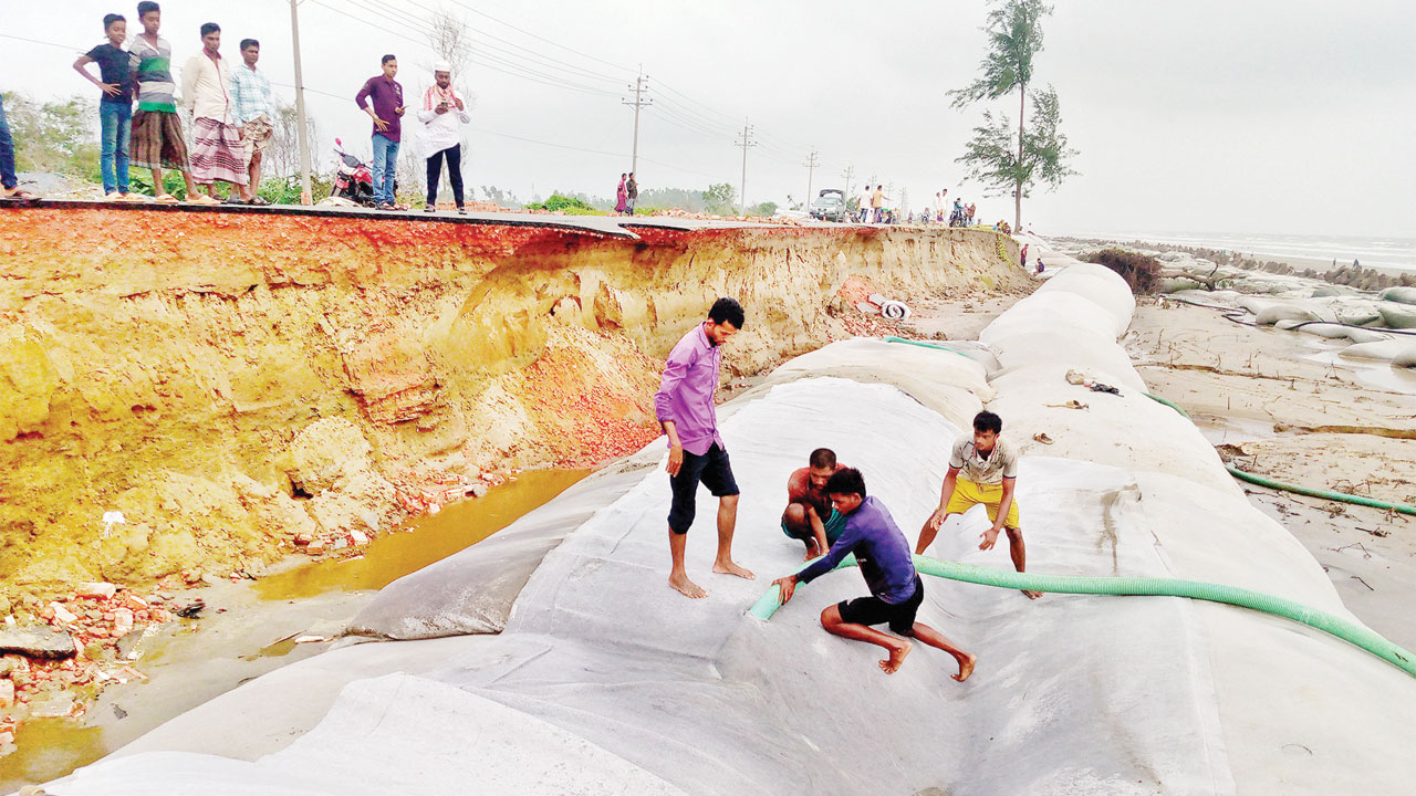 গতকাল সকাল সাড়ে ৮টা থেকে দুপুর পর্যন্ত ঢেউয়ের আঘাতে সড়কে নতুন করে ভাঙন সৃষ্টি না হলেও আগের ভাঙাগুলো বড় আকার ধারণ করে। সড়কের মুণ্ডার ডেইল অংশে দুই স্তরের জিও ব্যাগের মাধ্যমে বাঁধ নির্মাণ করা হয়েছে। তবে সেখানে এখন বড় বড় ঢেউ এসে জিও ব্যাগের ওপর আছড়ে পড়ছে। জোয়ার থাকার কারণে সংস্কারকাজ বন্ধ রয়েছে। জোয়ারের আঘাতে বিভিন্ন এলাকায় অর্ধশতাধিক ঝাউগাছ উপড়ে গেছে। এসব ঝাউগাছ কেটে নিয়ে যাচ্ছেন উপকূলীয় বন বিভাগের লোকজন।