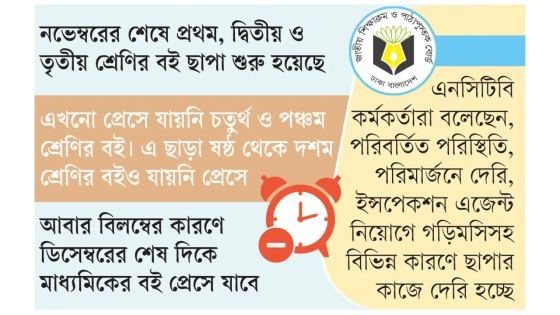এনসিটিবি সূত্রে জানা গেছে, নভেম্বরের শেষদিকে প্রথম, দ্বিতীয় ও তৃতীয় শ্রেণির বই ছাপার কাজ শুরু হয়েছে। এখনো প্রেসে যায়নি চতুর্থ ও পঞ্চম শ্রেণির বই। এই দুই শ্রেণির বইয়ের নোটিফিকেশন অব অ্যাওয়ার্ড (নোয়া) দেওয়া হয়নি। এ ছাড়া ষষ্ঠ থেকে দশম শ্রেণির বইও যায়নি প্রেসে। আবার বিলম্বের কারণে ডিসেম্বরের শেষদিকে মাধ্যমিকের বই প্রেসে যাবে। টেন্ডারের শর্তানুযায়ী, চতুর্থ ও পঞ্চম শ্রেণির বই ছাপার কাজ শুরু করতে করতেই ডিসেম্বর মাস শেষ হয়ে যাওয়ার কথা। এ ছাড়া প্রেসে পাঠানোর পরও প্রাথমিকের বইয়ে অন্তত তিনবার সংশোধনী দেওয়া হয়েছে। মাধ্যমিকেও একই অবস্থা হতে পারে। সেটিও ছাপার কাজে বিলম্বের অন্যতম কারণ হতে পারে।