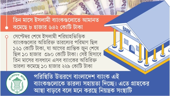 প্রতিবেদন অনুযায়ী, আলোচ্য সময়ে এসব ব্যাংকে অতিরিক্ত তারল্য কমেছে ৯৮ দশমিক ৪৫ শতাংশ। মূলত নতুন আমানত জমা না হওয়ায় এবং মাত্রাতিরিক্ত আমানত তুলে নেওয়ায় এমন পরিস্থিতি দেখা দিয়েছে। এতে বলা হয়, সেপ্টেম্বর শেষে ইসলামী শরিয়াহভিত্তিক ব্যাংকগুলোর অতিরিক্ত তারল্যের পরিমাণ ছিল ১৬১ কোটি টাকা। যা আগের প্রান্তিক জুন শেষে ছিল ১০ হাজার ৩৯০ কোটি টাকা। সেই হিসাবে তিন মাসের ব্যবধানে এসব ব্যাংকের অতিরিক্ত তারল্য কমেছে ১০ হাজার ২২৯ কোটি টাকা বা ৯৮ দশমিক ৪৫ শতাংশ।